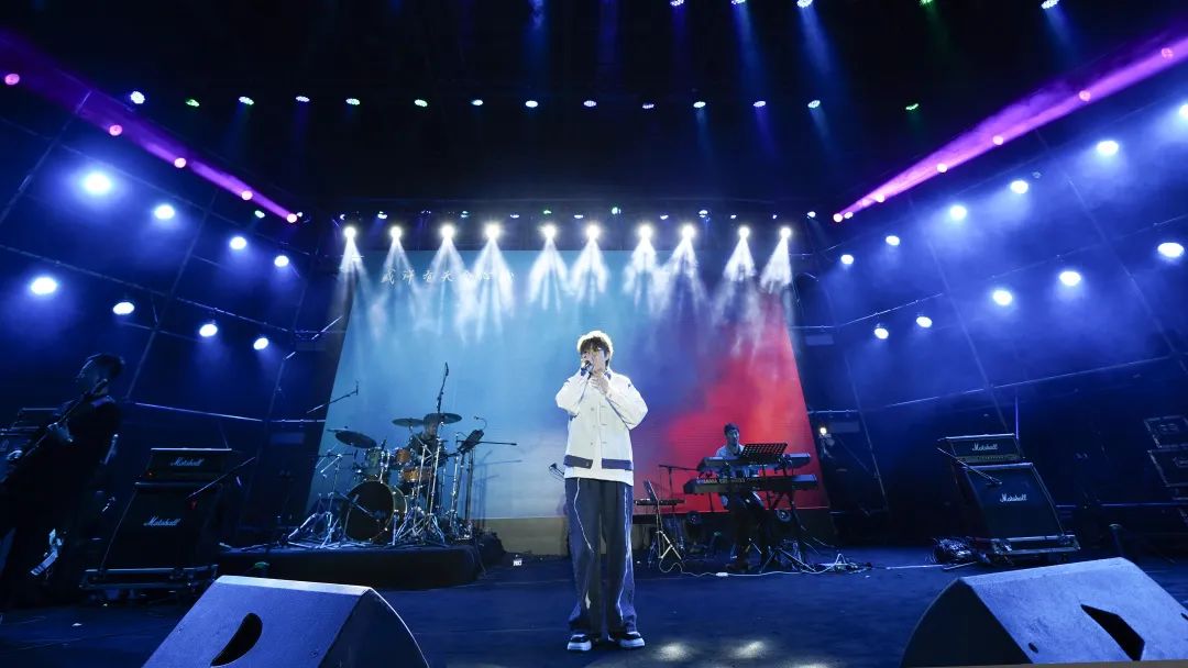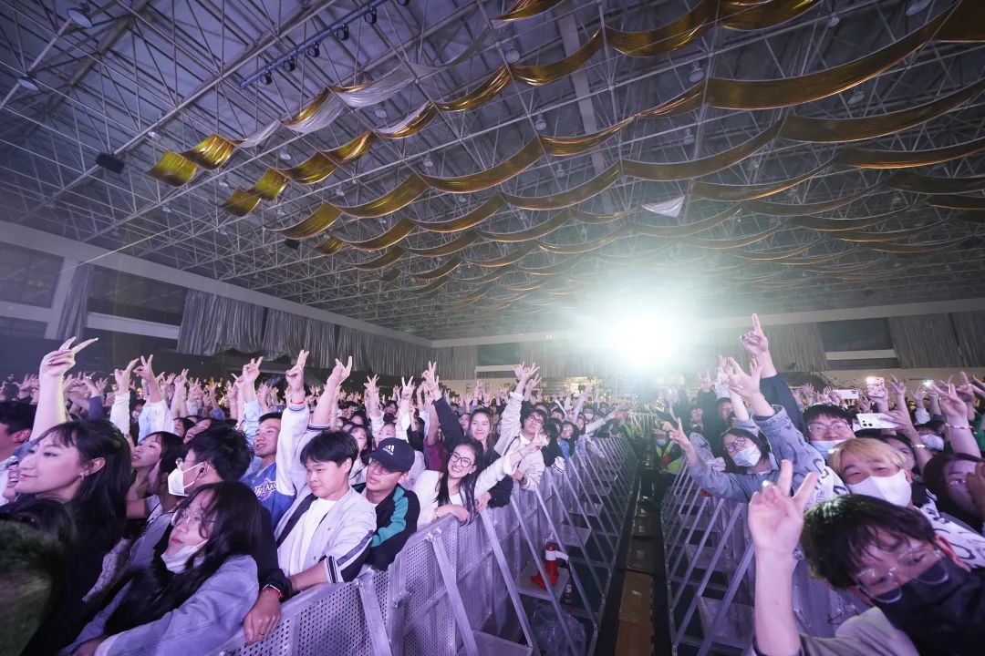 乔西的慵懒音色、冠南的鬼马弹奏,稳健的现场宛如行走的CD。台下同学纷纷打开手机的闪光灯跟随音乐摇摆起来,与乐队合唱《呼吸决定》《想淋雨就别走》等热门歌曲!