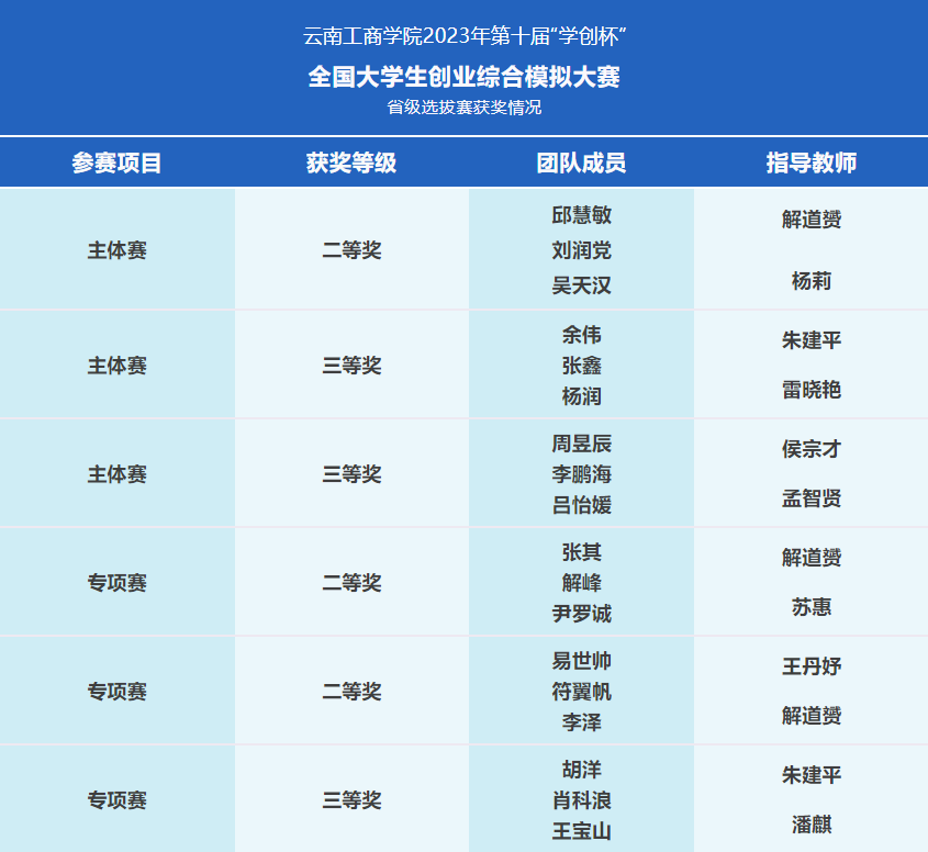 近日,2023年“学创杯”全国大学生创业综合模拟大赛云南省选拔赛落幕,云工商学子在大赛中表现优异,荣获二等奖3项、三等奖3项。