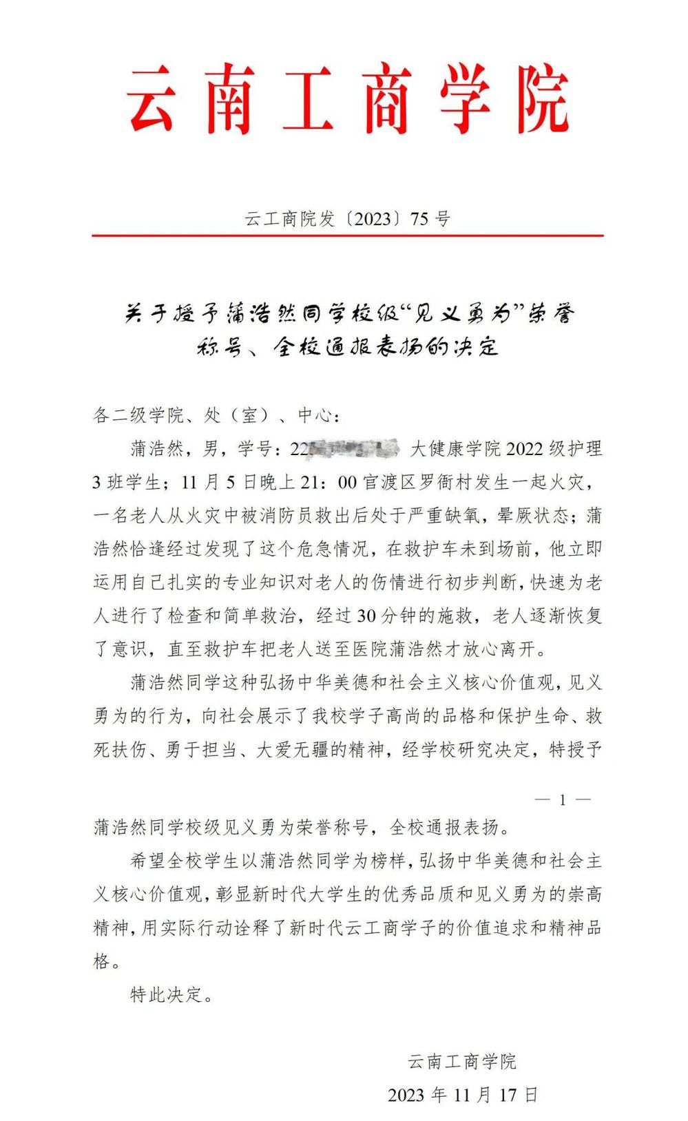 蒲浩然用实际行动深刻诠释了新时代云工商学子的价值追求和精神品格,被学校授予“见义勇为”荣誉称号,并予以全校通报表扬。
