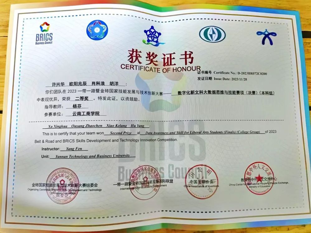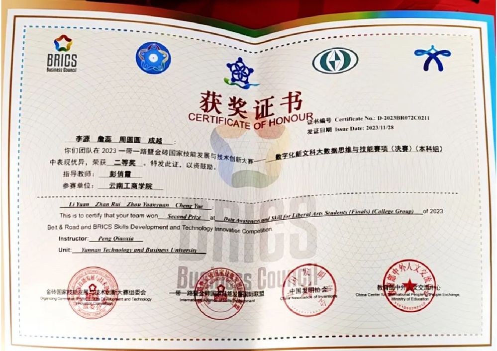 近日,beat365官方网站经济与管理学院师生在2023第七届一带一路暨金砖国家技能发展与技术创新大赛——数字化新文科大数据思维与技能竞赛国内总决赛中斩获多个奖项,其中,学生组本科赛道获得国赛二等奖2项,教师组获得国赛二等奖1项、优秀奖1项。
