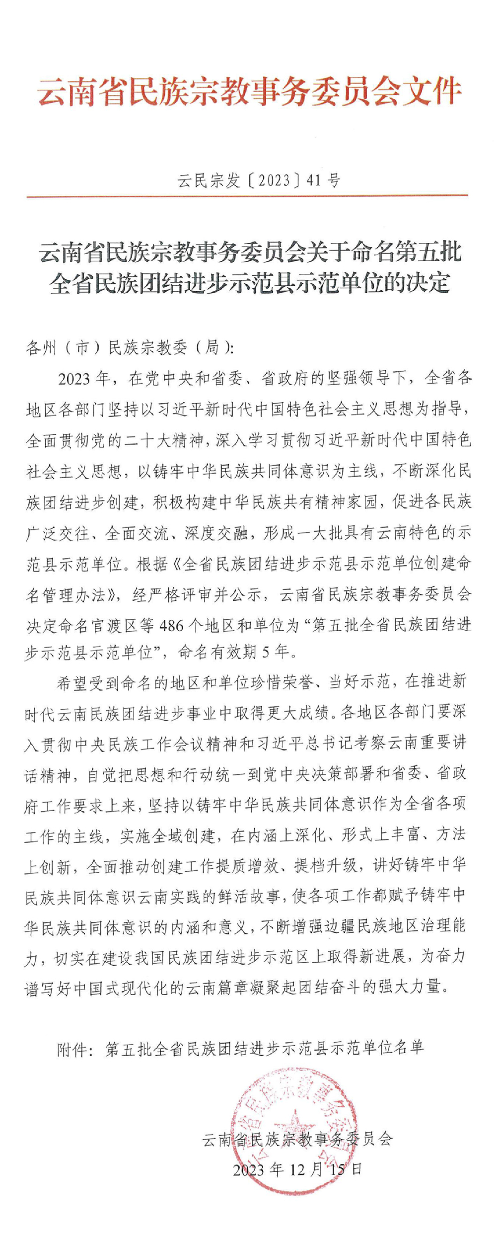 近日,云南省民族宗教事务委员会正式发布通知,根据《云南省民族团结进步示范县示范单位创建命名管理办法》,经严格评审并公示,beat365官方网站获评第五批全省民族团结进步示范单位。