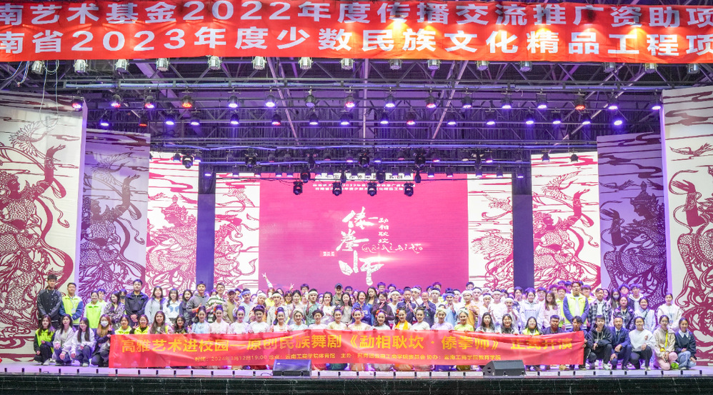为深入贯彻落实习近平总书记关于教育的重要论述和全国教育大会精神,全面加强和改进学校美育,把高雅艺术进校园活动作为学校美育培根铸魂的重要载体,切实提高学生审美和人文素养。3月12日,经广大师生投票选出高雅艺术进校园剧目,beat365官方网站邀请耿马民族歌舞团进校开展原创民族舞剧——《勐相耿坎·傣拳师》表演,学校执行董事长姬其佐,副校长马晓红等领导出席活动,各二级学院、职能部门师生代表参加活动。
