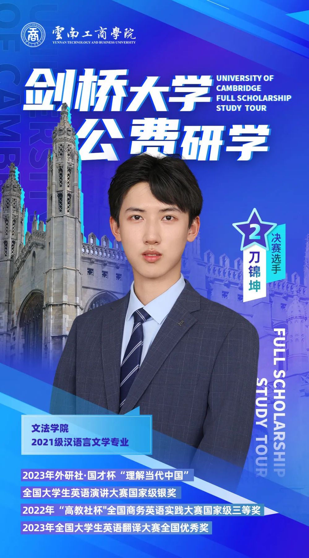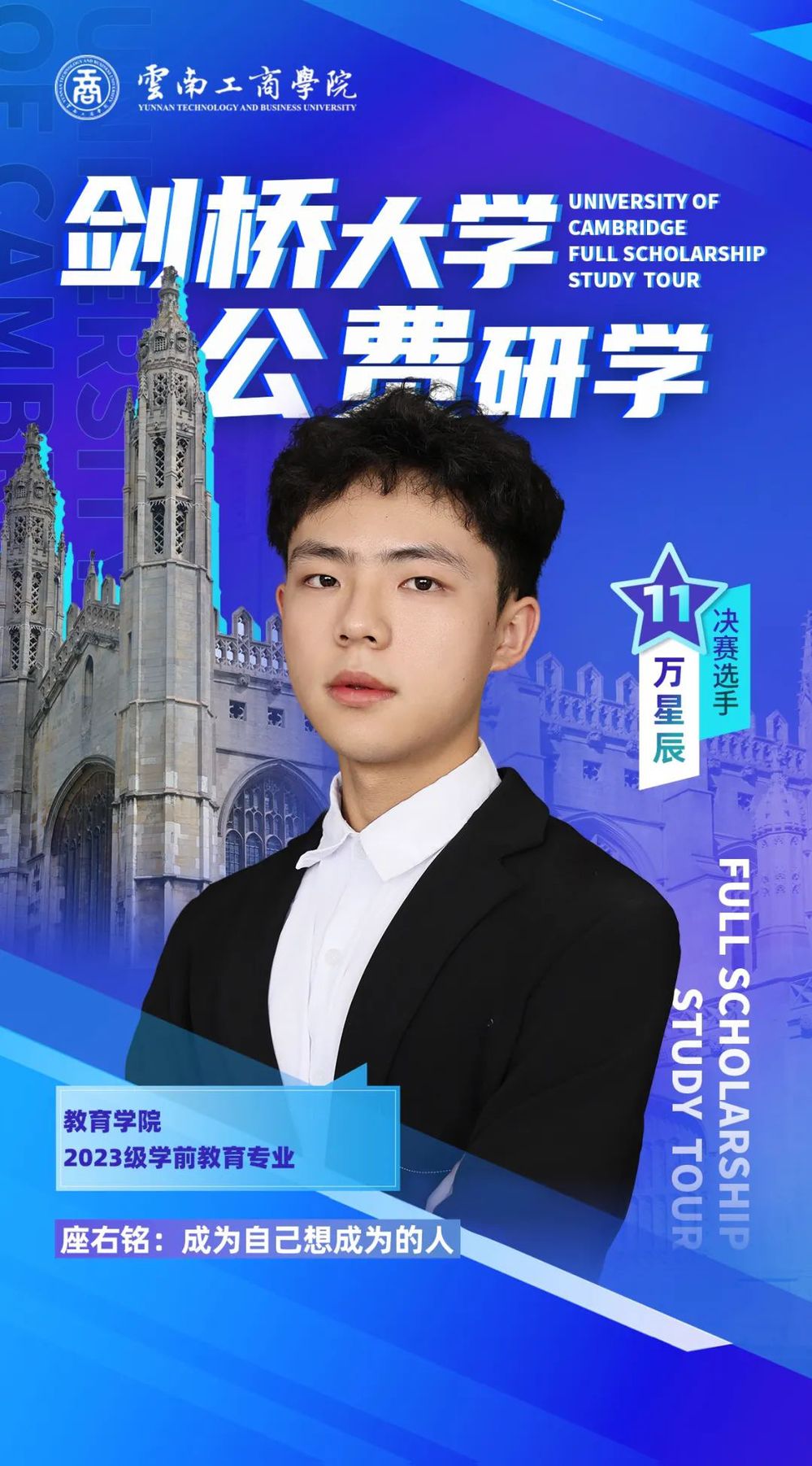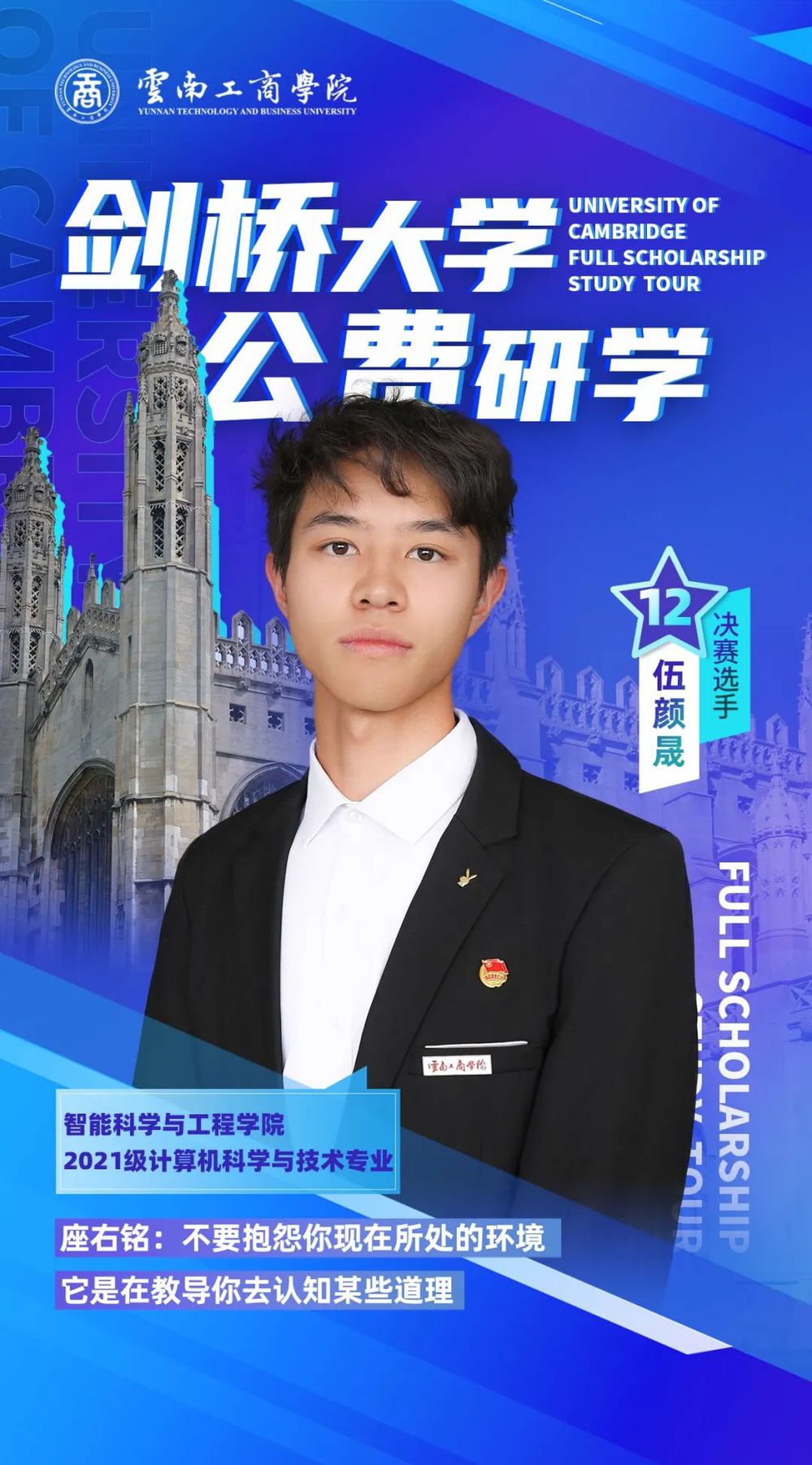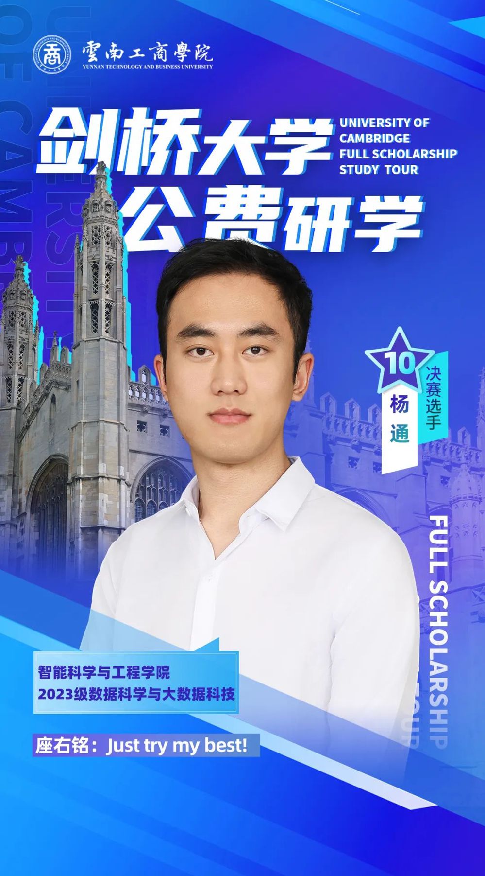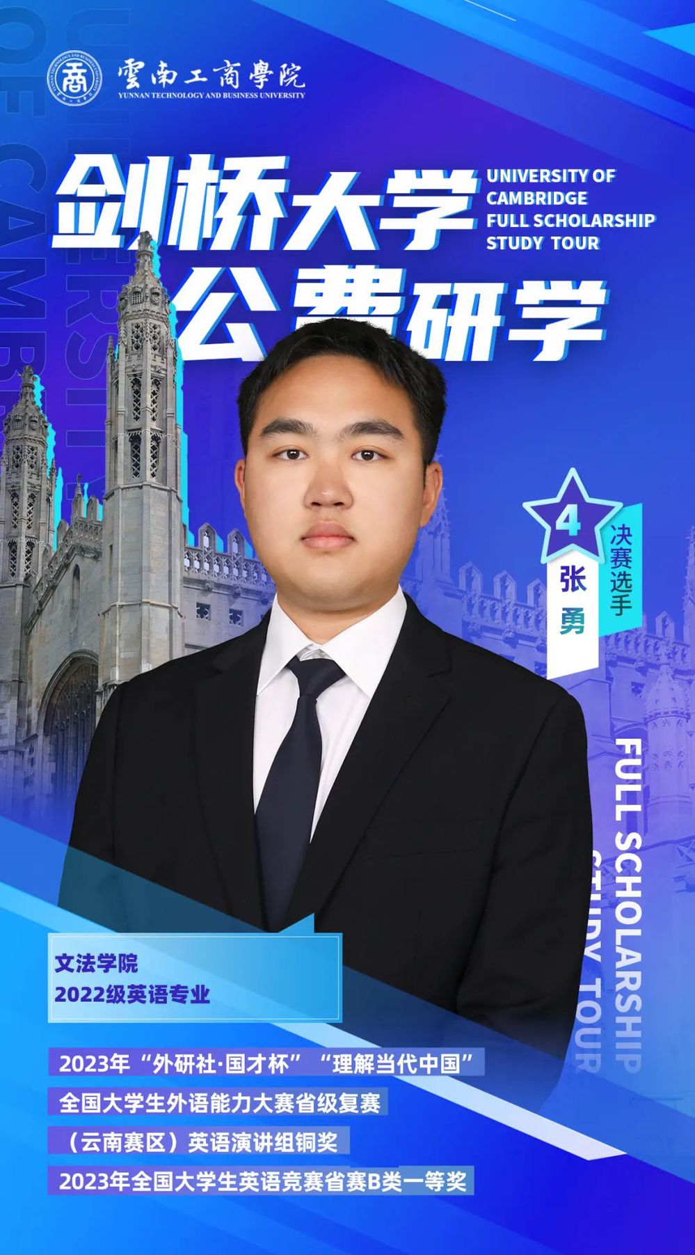 大家好,我是张勇,来自云南德宏。作为英语专业的学生,我经常代表学校参加各项大型比赛,希望在此次比赛中,我能够发挥好自己的实力,走向剑桥宣传我的家乡!