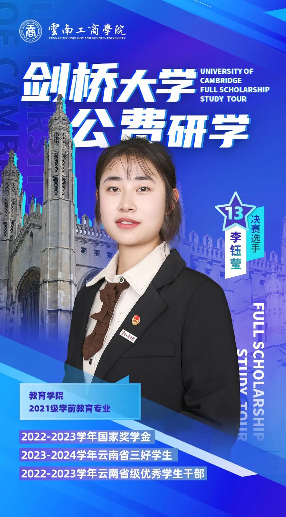 大家好,我是李钰莹,来自云南昆明。在校期间,我参与组织开展了100余场志愿活动。吾生也有涯,而知也无涯。我认为,世上没有白费的努力,也没有碰巧的成功,看似无心插柳,其实都是水到渠成。我希望自己能够抓住机会去成为一个勇敢积极的人,如果能成功入选我将尽自己所能传播中国文化。