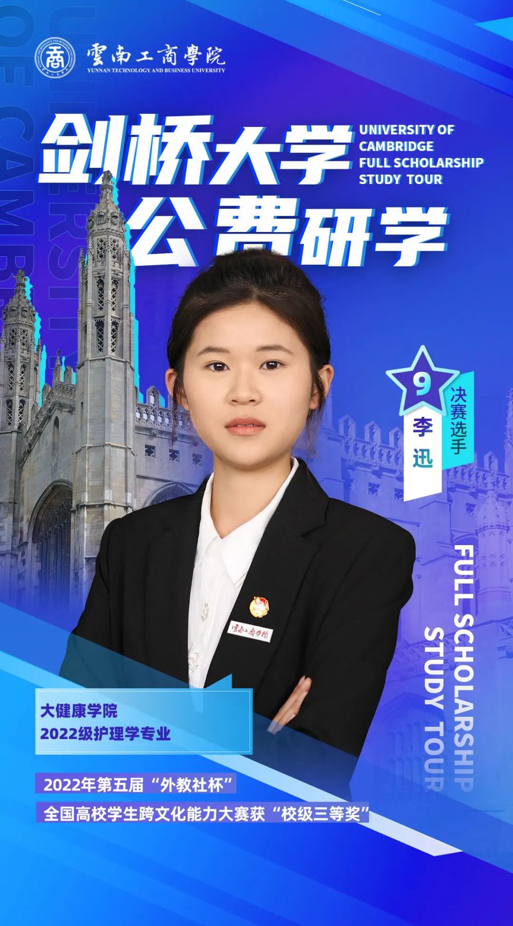 大家好,我是李迅,在校期间我积极参加各种活动和比赛,丰富学习生活、提高自身素养。我喜欢旅游,俗话说“读万卷书,行万里路”,在旅行中可以增加对世界的了解,开拓视野,增长经验。每一次经历都是一种成长,期待此次比赛。