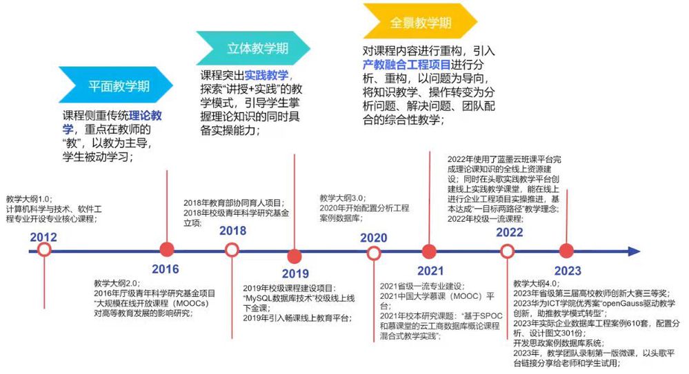 课程组坚持以问题为导向,经过艰辛的、长期的教学改革和探索实践,通过对课程内容进行重构,引入企业数据库工程项目深化“产教融合”人才培养模式,改革创新教学内容、环境、方法、过程、评价、思政6个环节,打造了“六有”课堂,成功推动课程进入了“综合性教学”的全景教学期。通过教学模式的改革创新,教学团队在解决课程痛点问题的同时,着力锻炼学生工程项目实践能力和持续自主学习能力,有效提升了学生高阶性思维,促进学生的全面发展。
