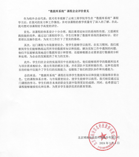 “数据库系统”课程教学改革创新成果显著,在第四届全国高校教师教学创新大赛云南赛区比赛暨云南省第七届高校教师教学创新大赛荣获二等奖,课程与华为深度产教融合,作品“openGauss驱动教学创新,助推教学模式转型——以《数据库系统》课程为例”,荣获2023华为ICT学院优秀案例评选比赛优秀奖,并被华为ICT学院报道(点击跳转报道链接)。