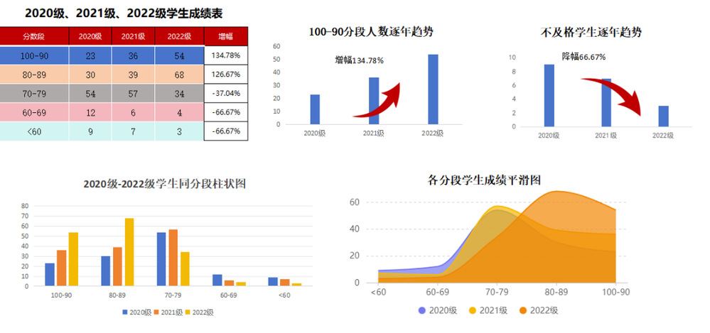 以2020级、2021级、2022级计算机科学与技术本科试点班级为例,教学改革创新后数据库系统课程的平均成绩逐年提升,最高增幅达34%。