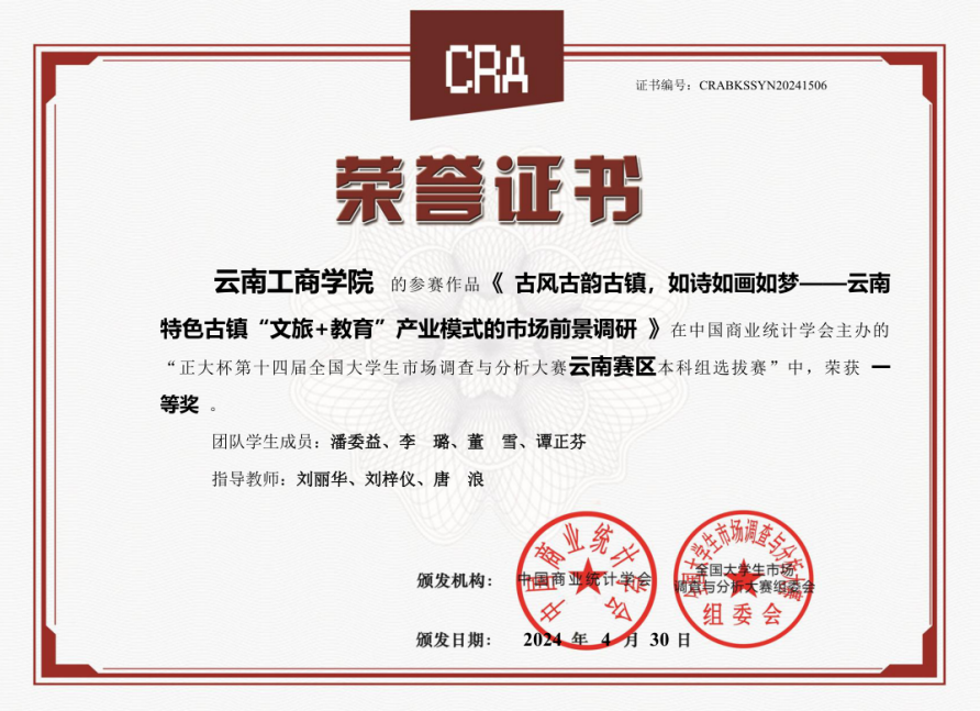 潘委益、李璐、董雪、谭正芬团队充分运用先进的市场调研技术,结合扎实的专业知识,对目标市场进行了深入且细致的分析,从中洞察市场趋势,提炼出有价值的商业信息,在比赛中展现了对市场的深刻理解和独到见解,荣获省赛一等奖。