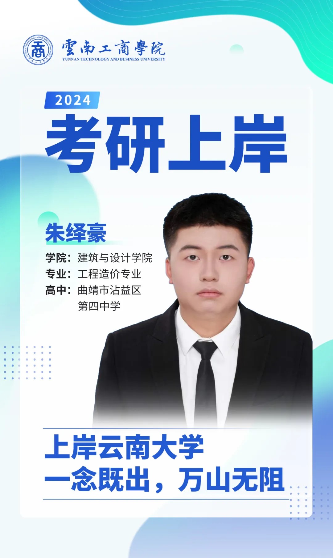 大家好,我是朱绎豪。高中毕业于曲靖市沾益区第四中学。大学期间曾获得国家励志奖学金,校级优秀学生干部等荣誉称号。