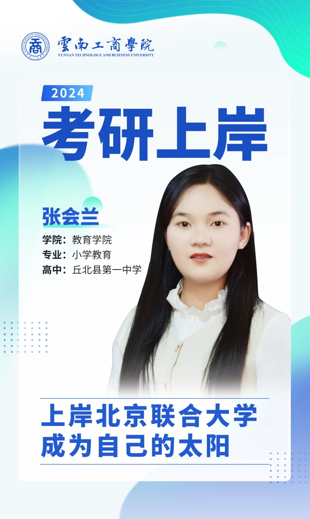 大家好,我是2020级【本科】小学教育4班的学生张会兰,高中毕业于丘北县第一中学。大学期间我努力学习,积极参加比赛活动,获得“国家励志奖学金”“云南省级三好学生”“云南省优秀毕业生”“全国大学生教资能力大赛初赛三等奖”的荣誉。