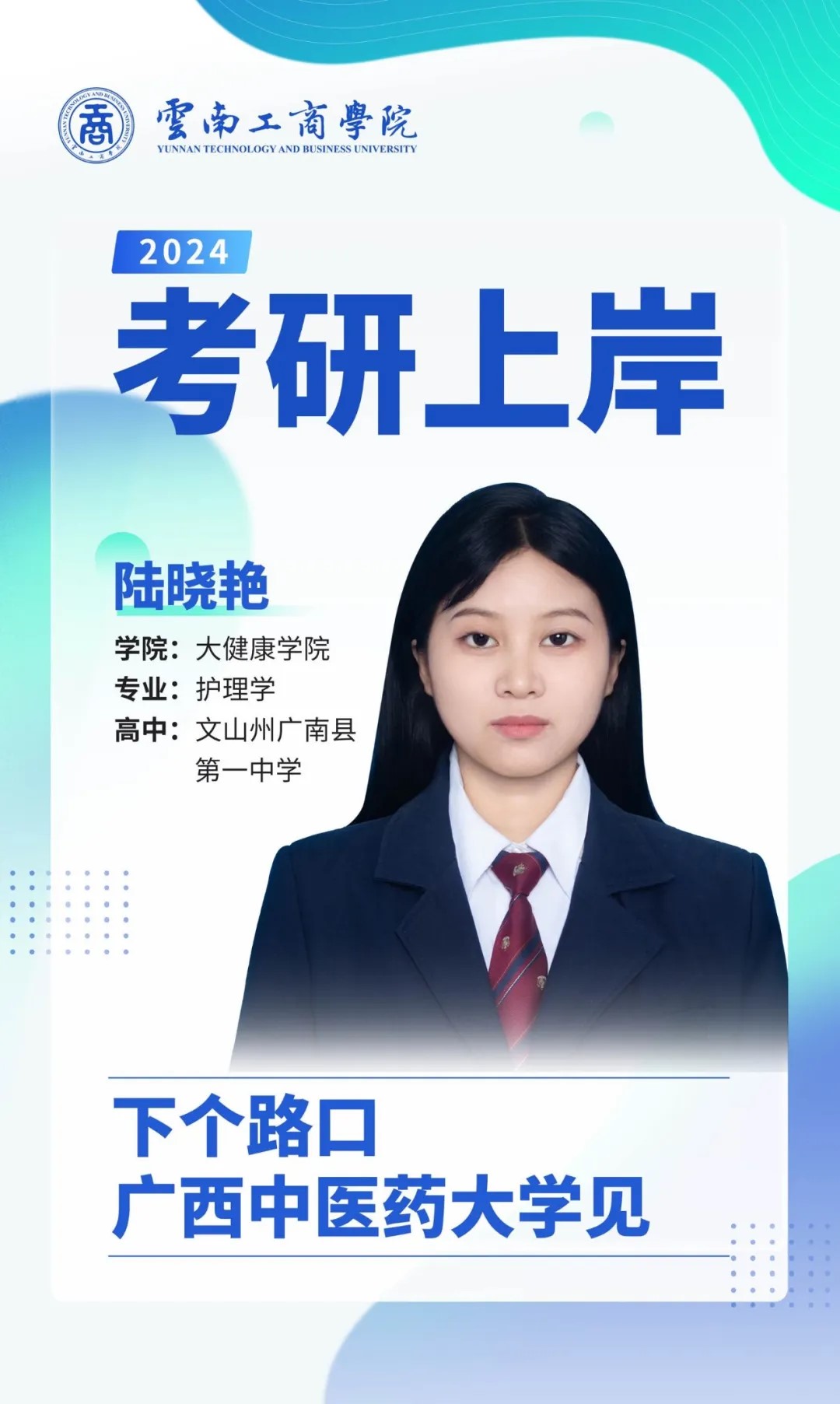大家好,我是陆晓艳。高中毕业于文山州广南县第一中学,今年考研顺利上岸广西中医药大学,研究方向是妇产科护理学。大学期间曾获得筑梦奖学金和校级优秀毕业生。