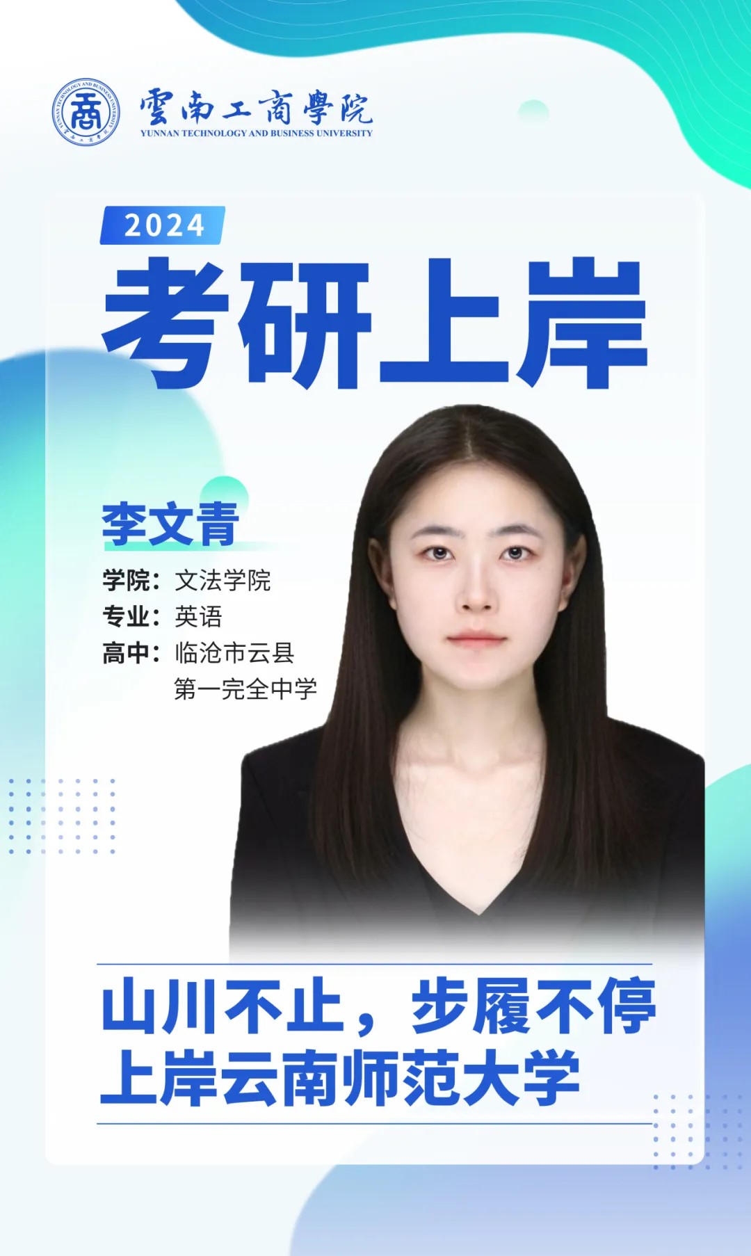 在人生的旅程中,考研是一段独特而充满挑战的经历。这是通往未来的一步,也将是卓越的起点,考研者行囊里装满了期待,开启心向往之未来。来自文法学院2020级【本科】英语3班的李文青同学考研成功上岸云南师范大学,她以“希望是美好的,也许是人间至善,而美好的事物永不消逝 ”为人生格言,走出了一条属于自己的成功之路。