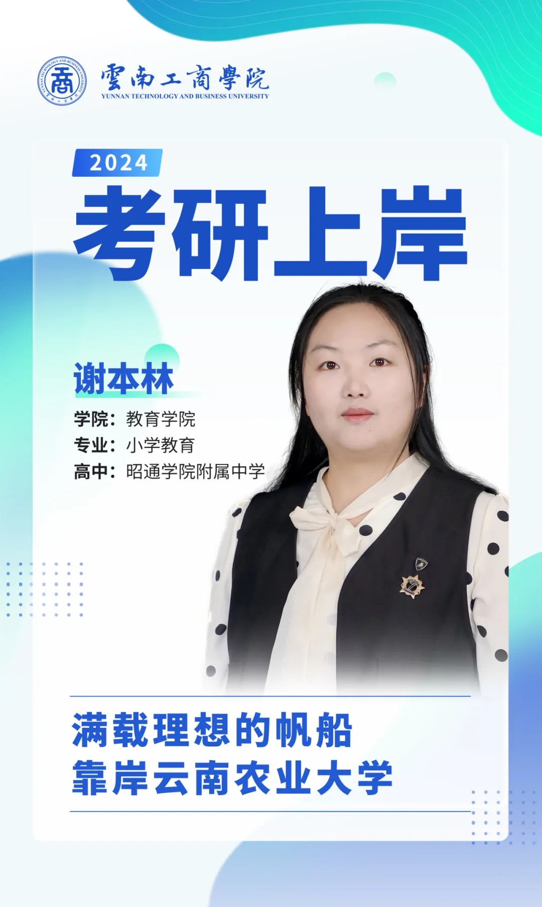 大家好,我是谢本林。高中毕业于昭通学院附属中学,今年考研顺利上岸云南农业大学,研究方向是社会工作。大学期间获得校级“优秀毕业生”、国家励志奖学金、云南省级三好学生、校团委办公室“优秀学员”、beat365官方网站“三好学生”、党校发展对象培训“优秀学员”等奖项若干。