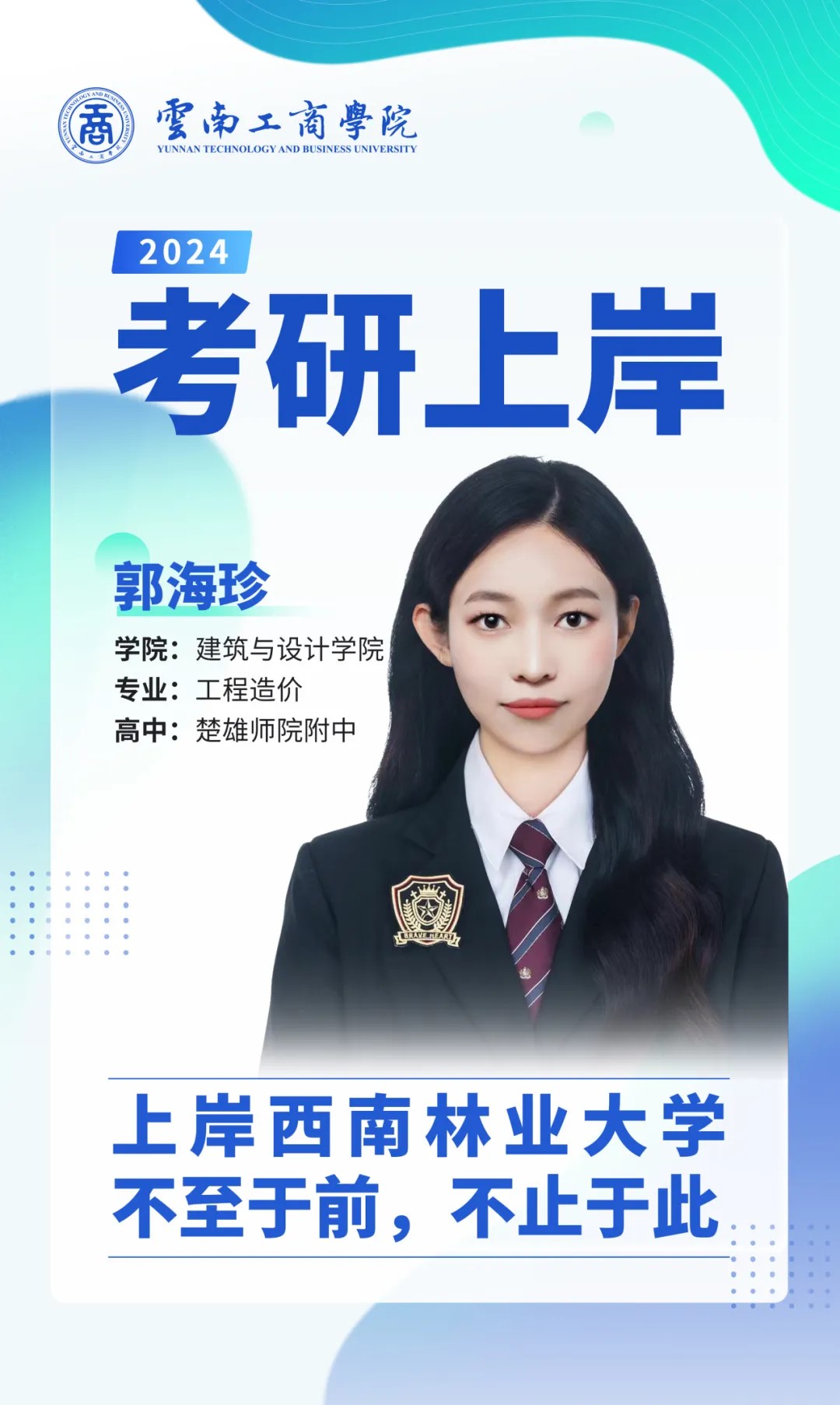 大家好,我是郭海珍。高中毕业于楚雄师院附中,考研上岸西南林业大学。大学期间曾获得“自强之星”、校级优秀毕业生等荣誉称号。