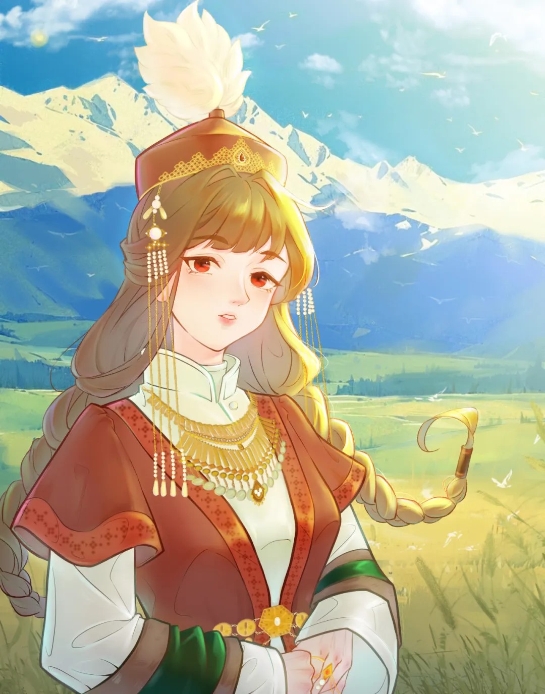 来自2023级【专升本】视觉传达设计2班的梁琤,从小就对动漫游戏世界充满好奇,对绘画艺术怀有浓厚的兴趣,他说:“除了艺术创作,我还热爱旅游,喜欢亲身踏足不同的土地,用眼睛去发现世界的美好,用心去感受各地的文化与故事。”这次阿勒泰采风之旅,他将自己在那片广袤无垠的自然之中,感受到的自然壮丽之美和淳朴热情的哈萨克族牧民相结合,描绘出了这一幅哈萨克少女与雪山、草原相照应的绘画。在雪山之巅、草原之畔,自然之子与天地共舞,正是对阿勒泰这片土地上人与自然和谐共生最纯粹的表达。