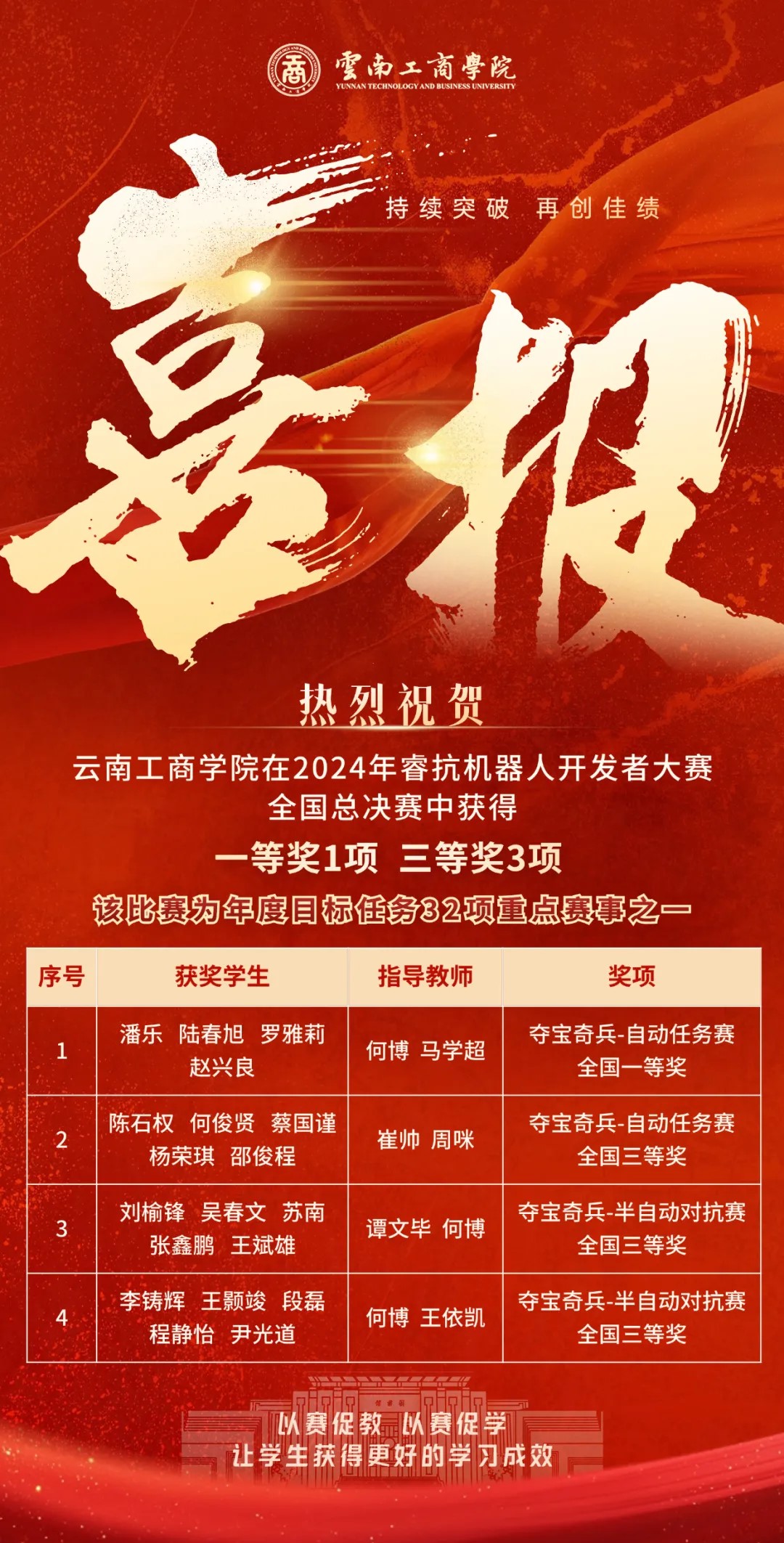 近日,2024睿抗机器人开发者大赛(RAICOM)“夺宝奇兵”全国总决赛圆满落幕,beat365官方网站在比赛中斩获佳绩,获得全国一等奖1项,全国三等奖3项的好成绩。