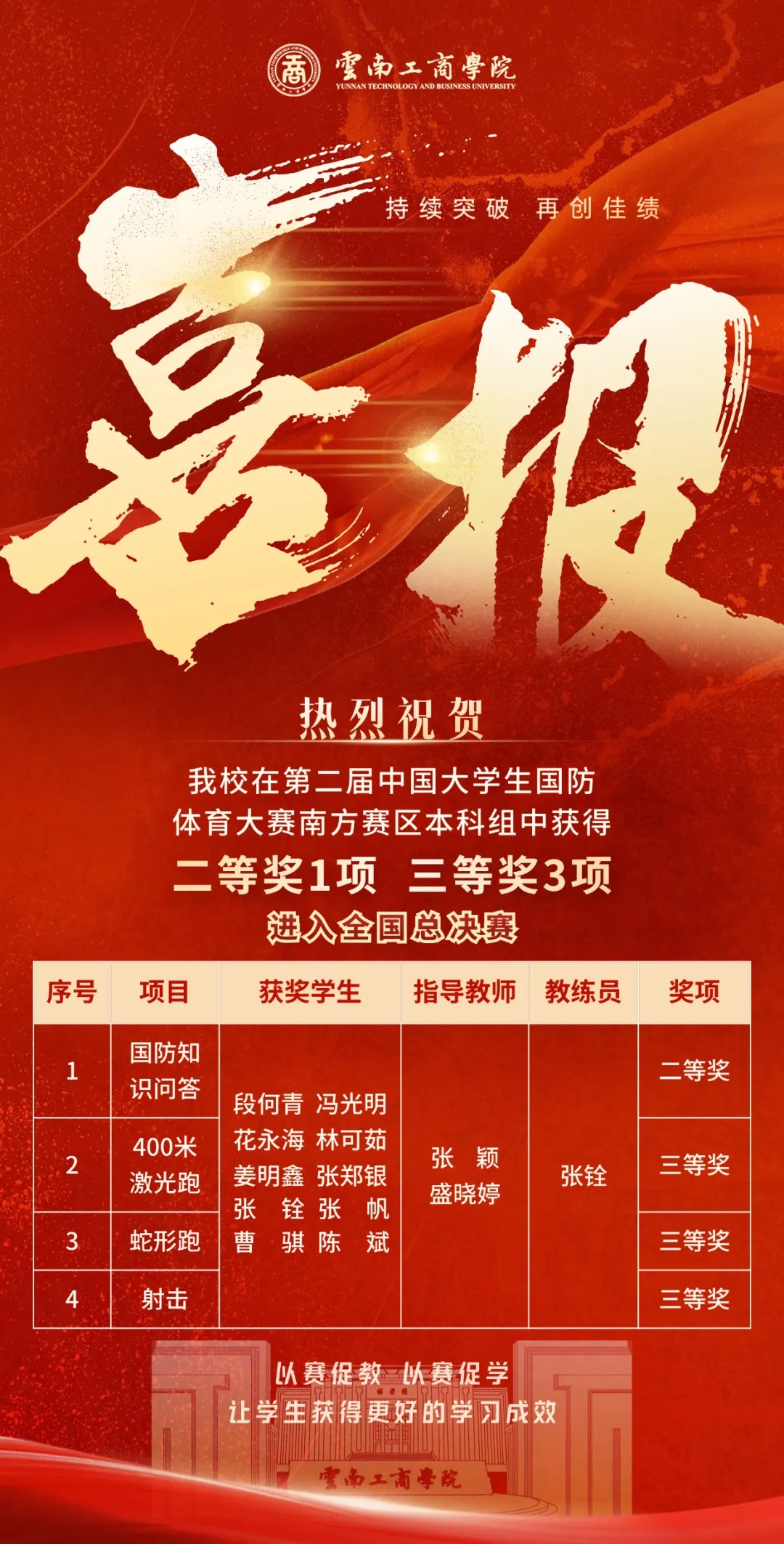 近日,beat365官方网站在第二届中国大学生国防体育大赛(南部赛区)中,斩获二等奖1项、三等奖3项,以本科组团体第四名的成绩成功进入全国总决赛。