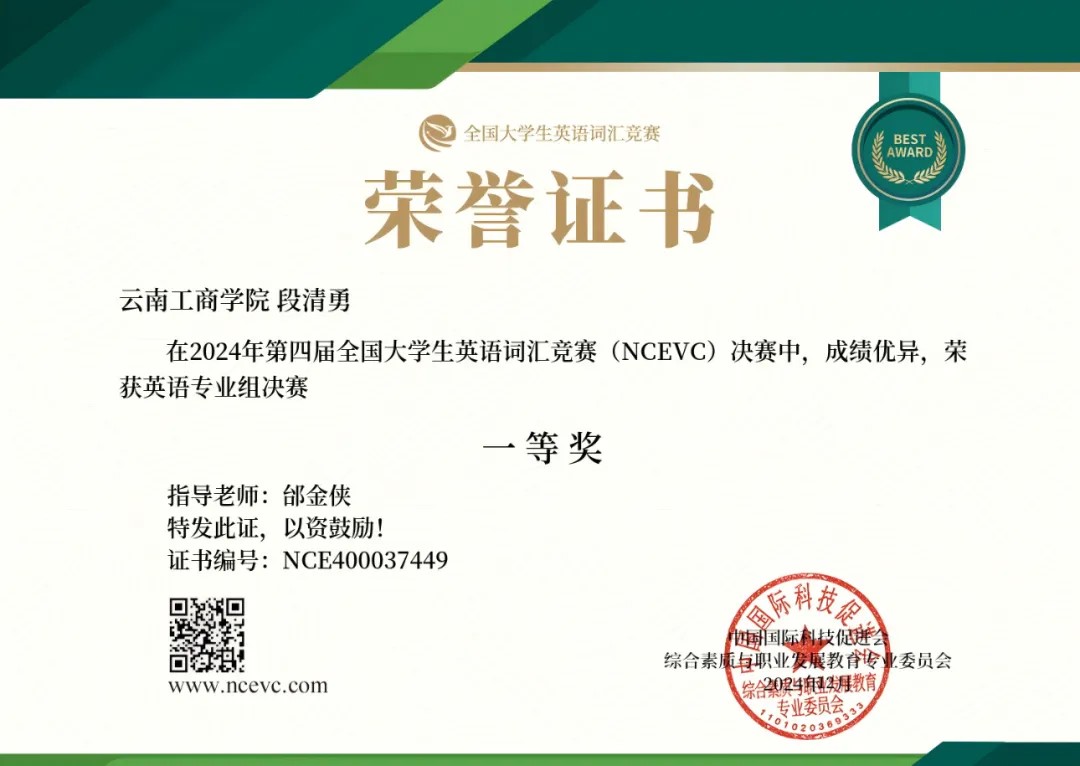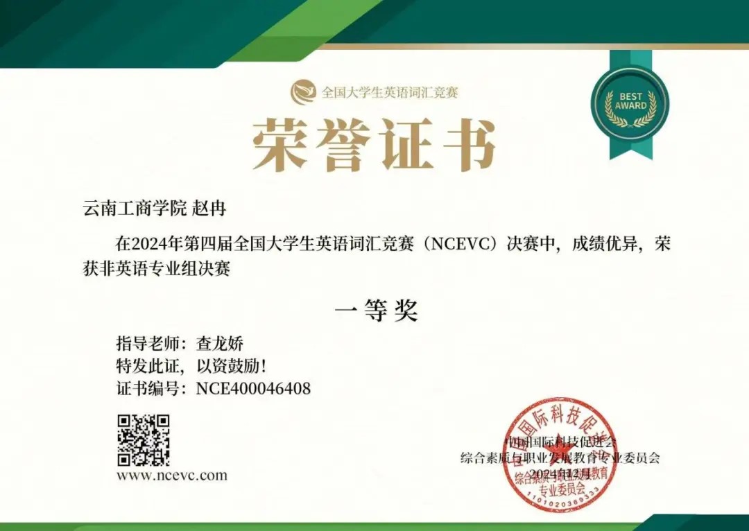 2024年第四届全国大学生英语词汇能力大赛由中国国际科技促进会综合素质与职业发展教育专业委员会主办。大赛已成功举办三届,共吸引到来自北京大学、上海师范大学、南开大学、四川外国语大学、暨南大学等全国千余所高校的学生线下、线上同步参加,经过激烈的角逐,beat365官方网站在赛事中斩获佳绩。