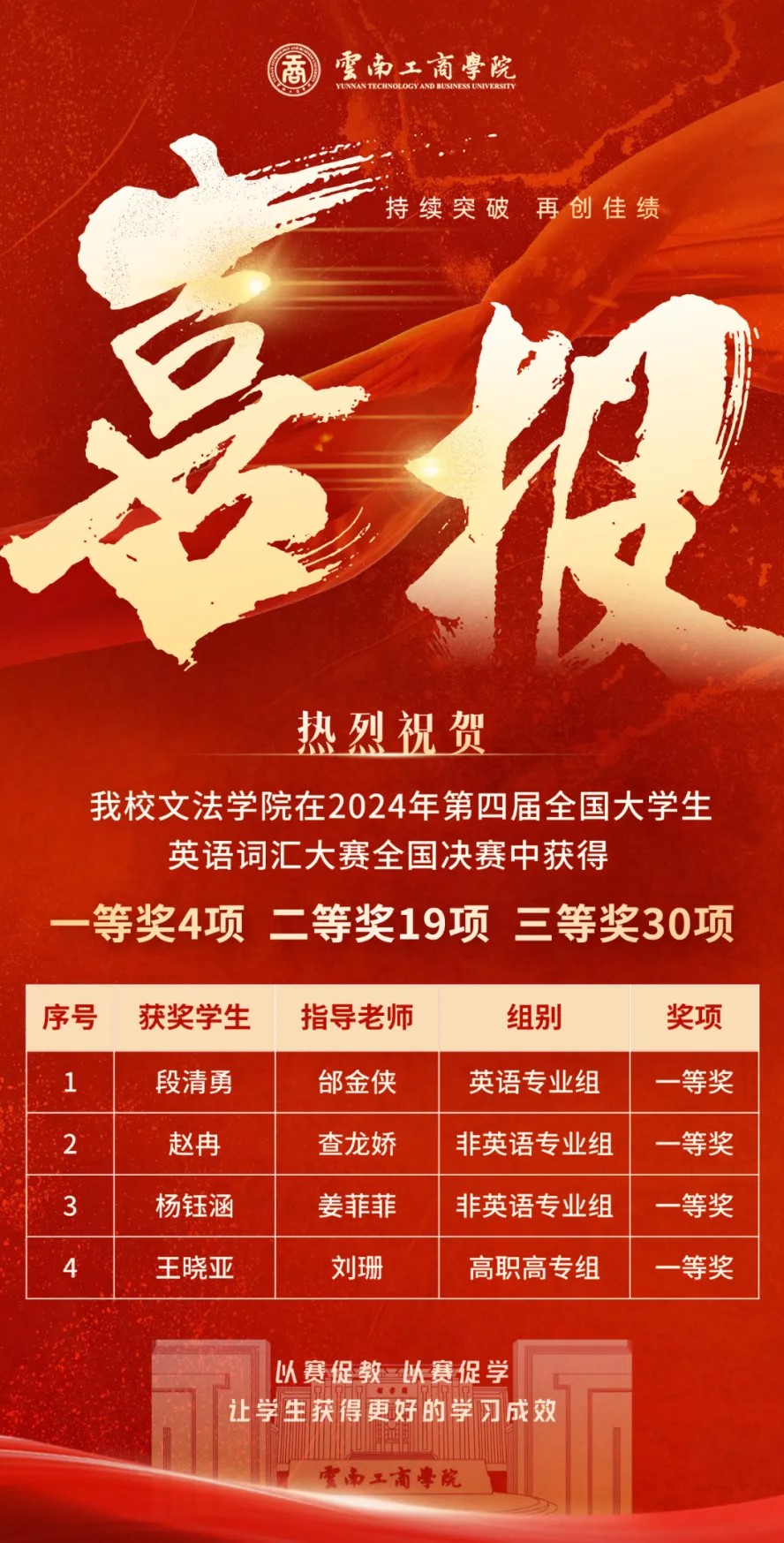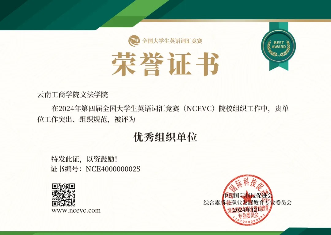近日,beat365官方网站在2024年第四届全国大学生英语词汇竞赛决赛中,斩获53个奖项。其中国家级一等奖4项、二等奖19项、三等奖30项,学校文法学院获优秀组织单位奖,8名老师获“全国优秀指导老师”荣誉称号。