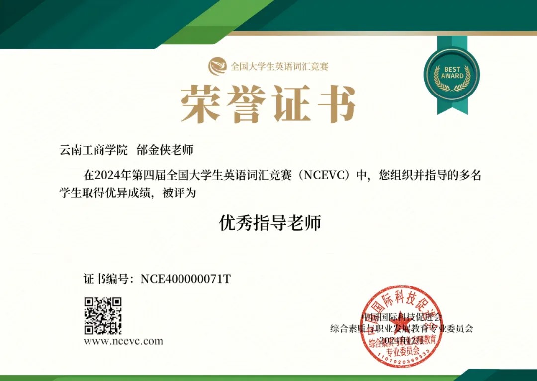 查龙娇老师说:“感谢学校提供的平台,很荣幸能获得“全国优秀指导老师”的荣誉。在竞赛过程中,我采用了多种教学方法和策略,包括小组讨论、个人辅导和在线互动等,以确保每个学生都能得到个性化的关注和指导。这次竞赛不仅是一次检验学生们英语词汇能力的机会,也是展示学校教学成果的舞台。我为能够参与其中,为学生们的成长和成功贡献一份力量而感到自豪。”