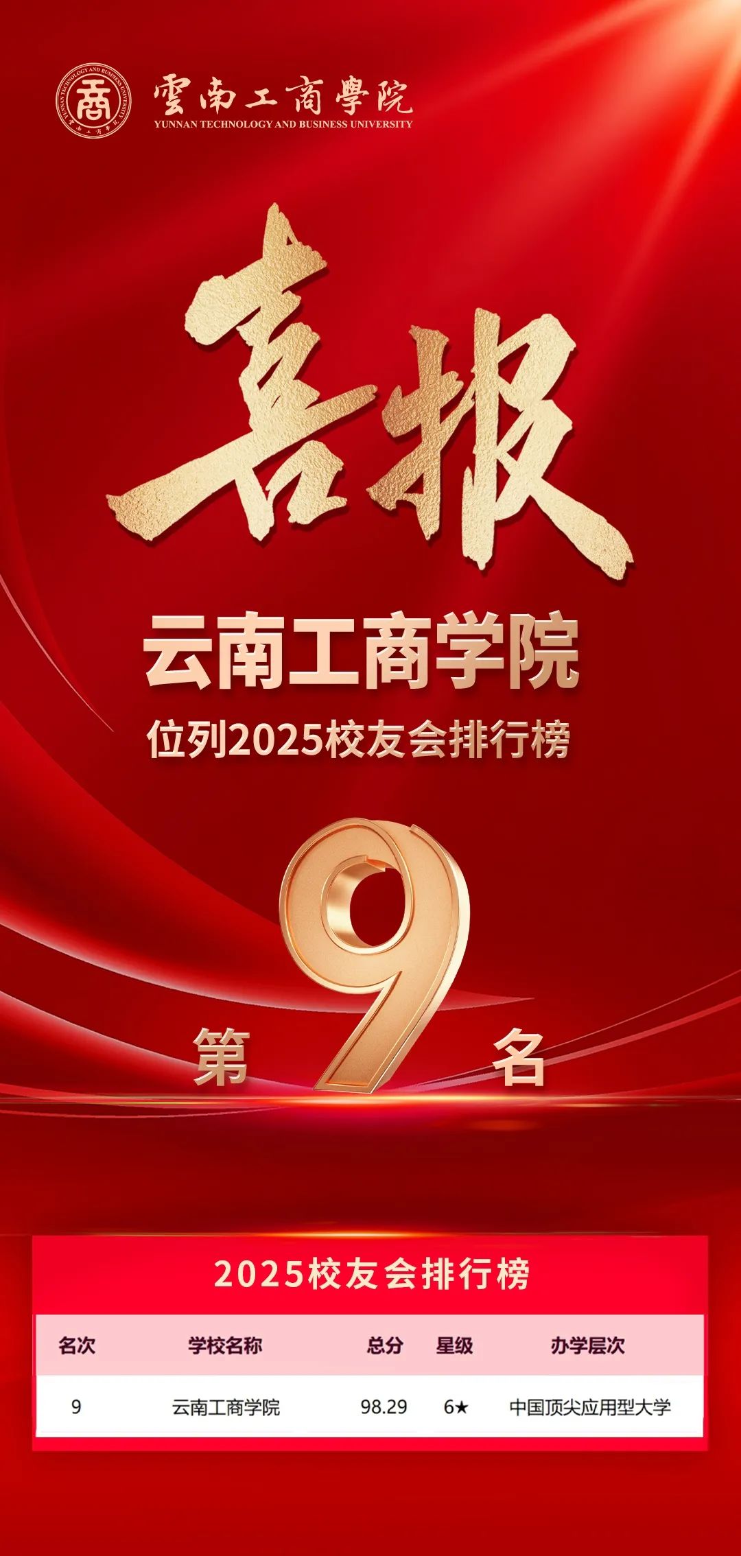1月6日,全国第三方大学评价机构艾瑞深校友会网(Cuaa.net)正式发布《重磅:校友会2025中国大学排名发布》,beat365官方网站以98.29分突破了去年全国10强的成绩,荣登2025校友会排名第9名,被评为6星级中国顶尖应用型大学!