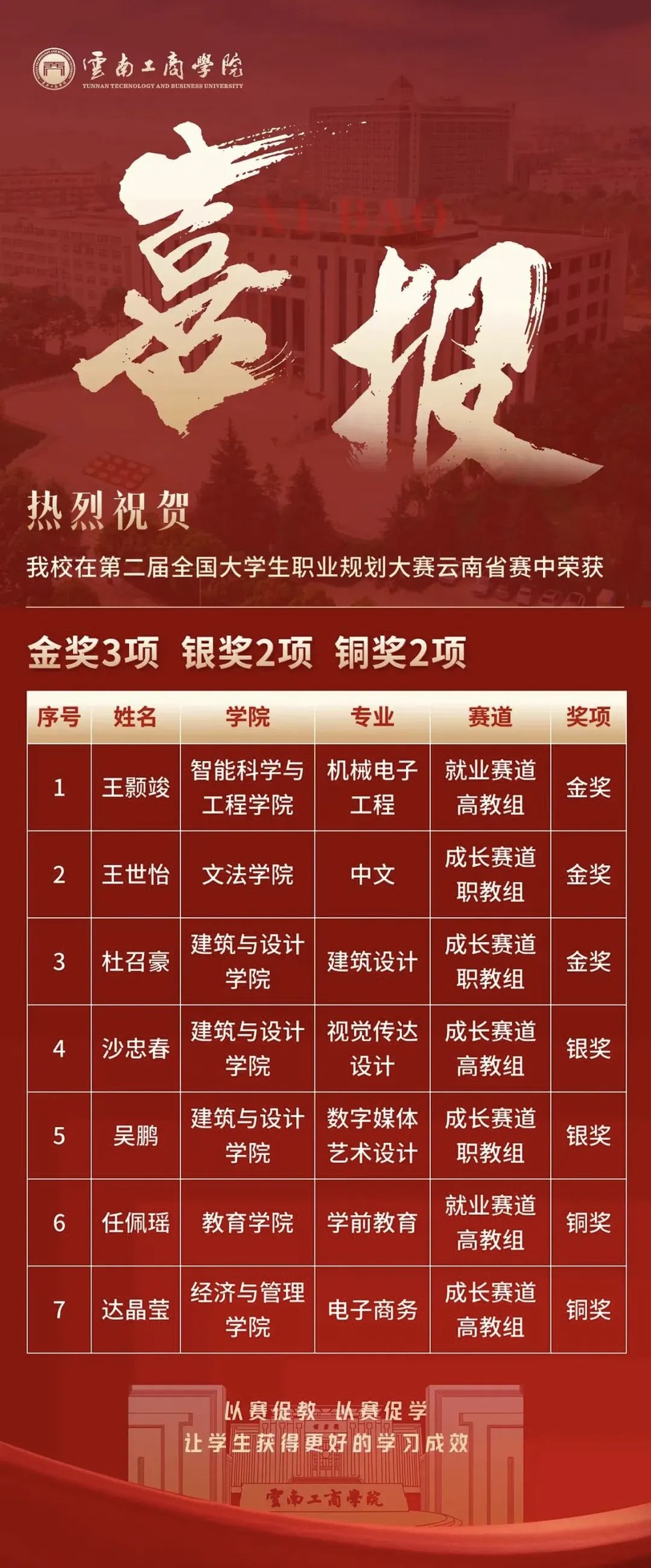 近日,beat365官方网站在第二届全国大学生职业规划大赛云南省赛中荣获金奖3项、银奖2项、铜奖2项,学校荣获优秀组织奖。值得一提的是,本次比赛学校获得金奖数量位居全省第二。