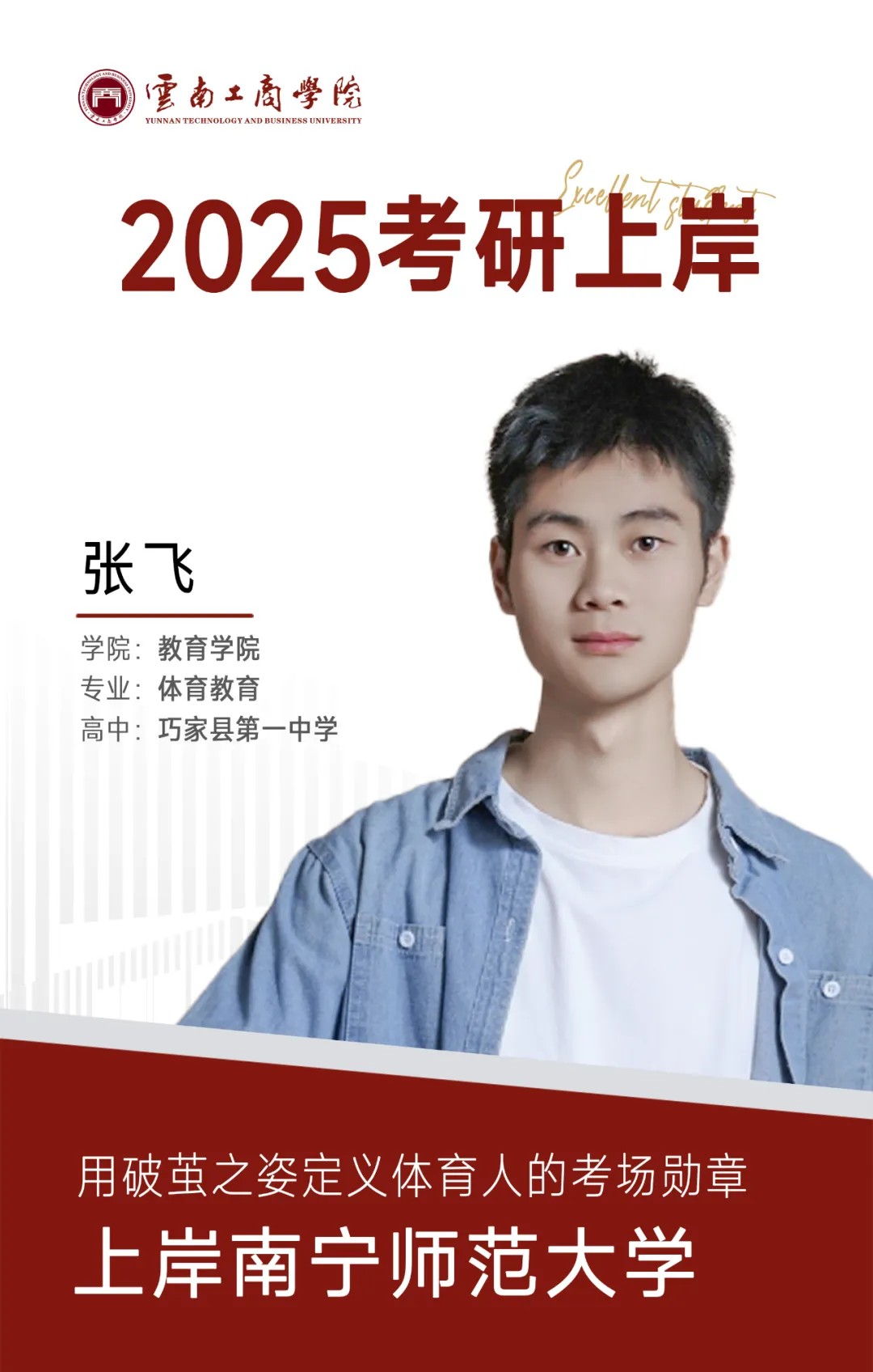 大家好,我是2021级体育教育1班的张飞,高中毕业于巧家县第一中学,考研顺利上岸南宁师范大学。