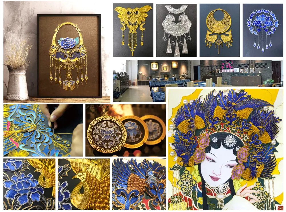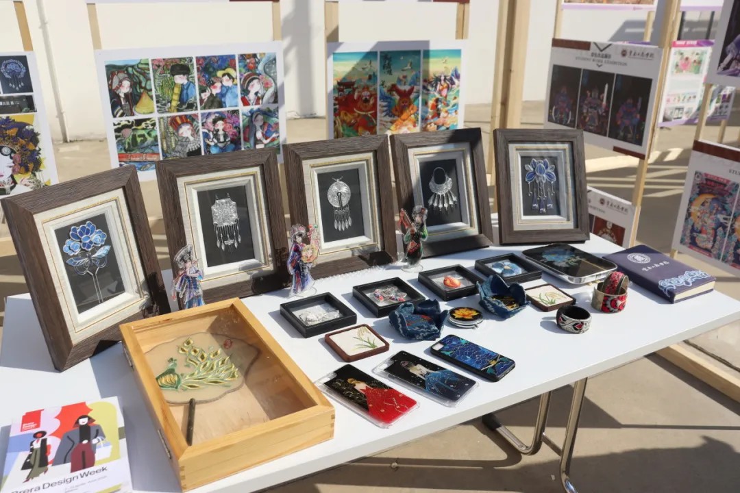 尤为引人瞩目的是学校建筑与设计学院教师谢晶教授独创的“翠羽银丝工艺” 系列作品。这一工艺大胆突破传统,巧妙融合了点翠、掐丝、景泰蓝、岩画等多种传统技艺,实现了创新性的转化与发展。目前,该工艺已成功获得1项国家发明专利、3项实用新型专利以及百余项版权登记。其学生团队基于此工艺开发的文创设计作品,不仅被东方航空公司选为国礼赠予外国政要,更在展览现场成为了国际关注的焦点,收获了广泛赞誉。借助这一平台,学校师生不仅向世界展示了云南民族文化的深厚底蕴,也为推动中国设计走向国际舞台贡献了更多智慧与创意。