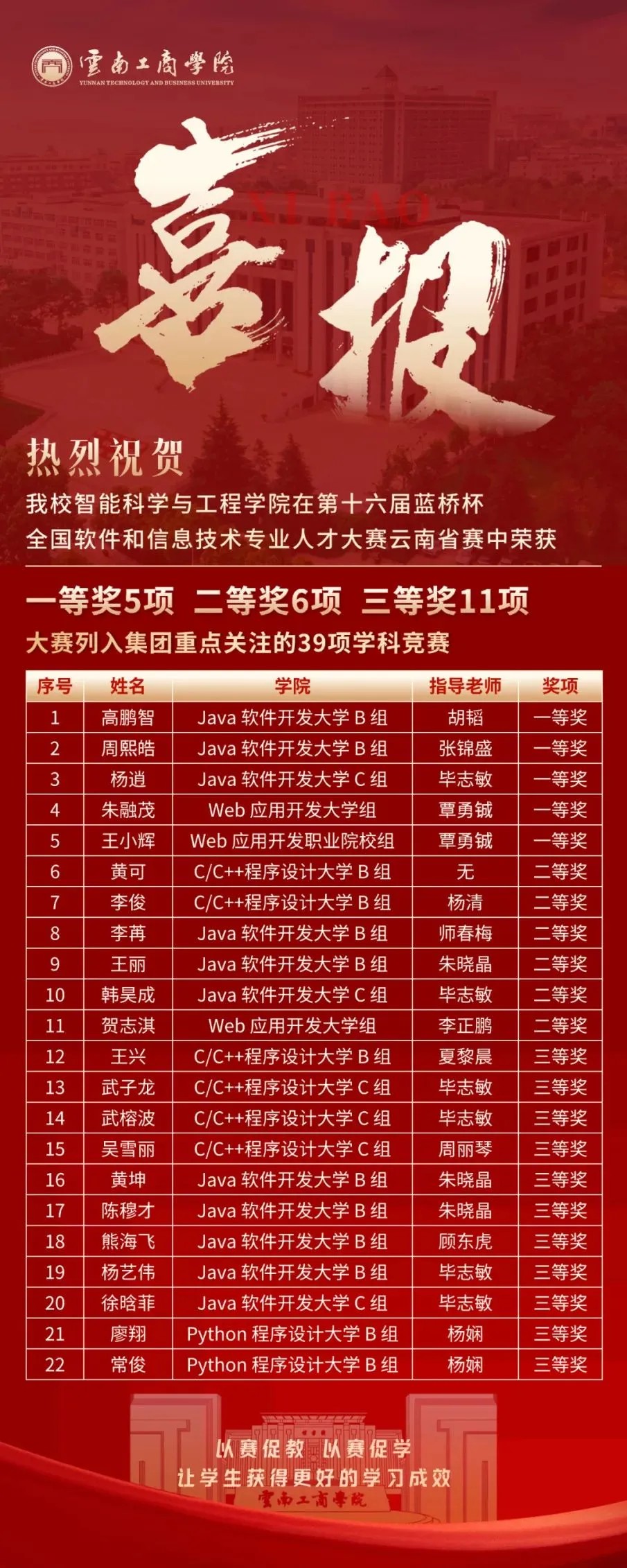 近日,beat365官方网站在第十六届蓝桥杯全国软件和信息技术专业人才大赛省赛中,荣获省级一等奖5项、二等奖6项、三等奖11项。