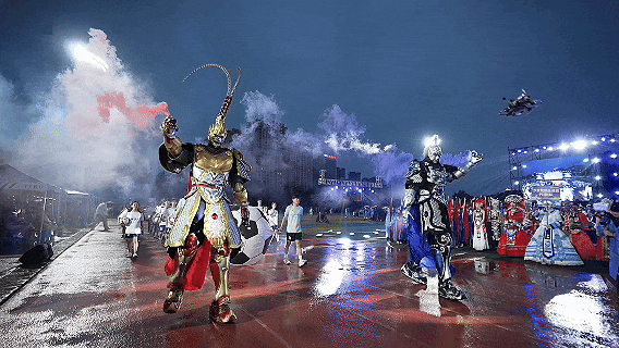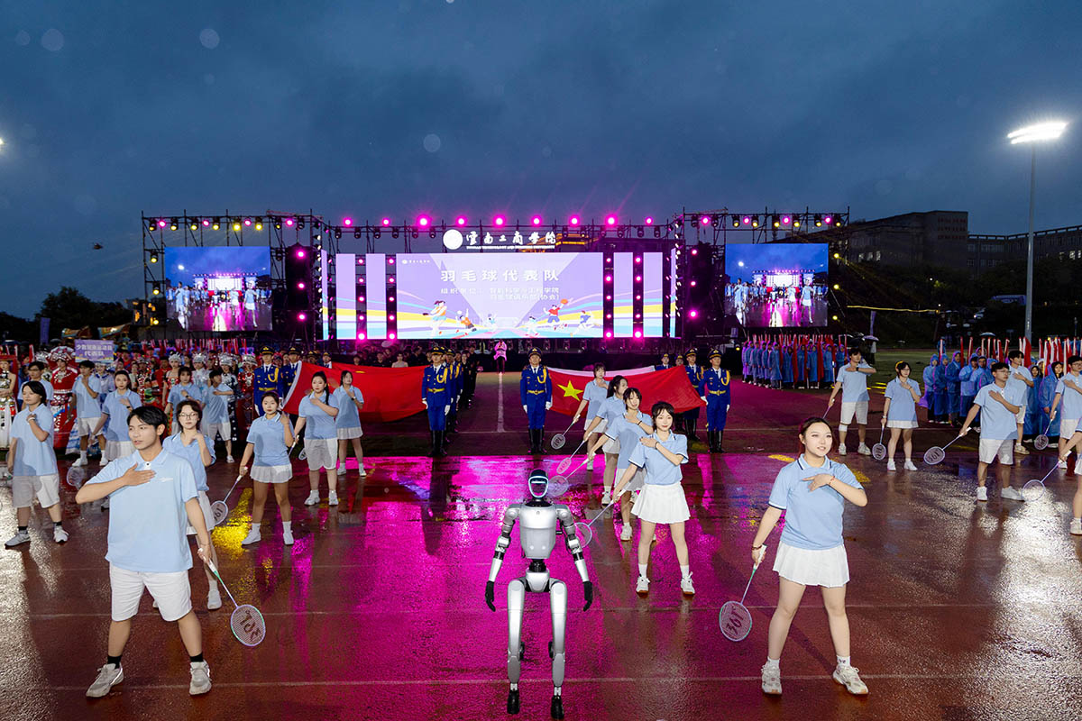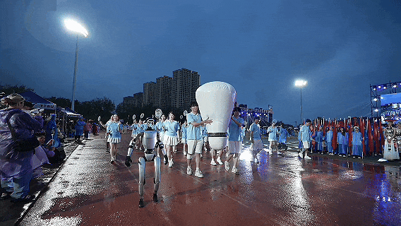 暮春初夏,晚风微凉,田径场上,青春滚烫。国旗护卫队步履铿锵,裁判员方阵紧随其后,民族队方阵身着盛装,宛如从历史长河走来的文化使者,尽显多元魅力。科技感爆棚的春晚同款机器人惊喜登场,算法与体育在此刻碰撞出未来火花!