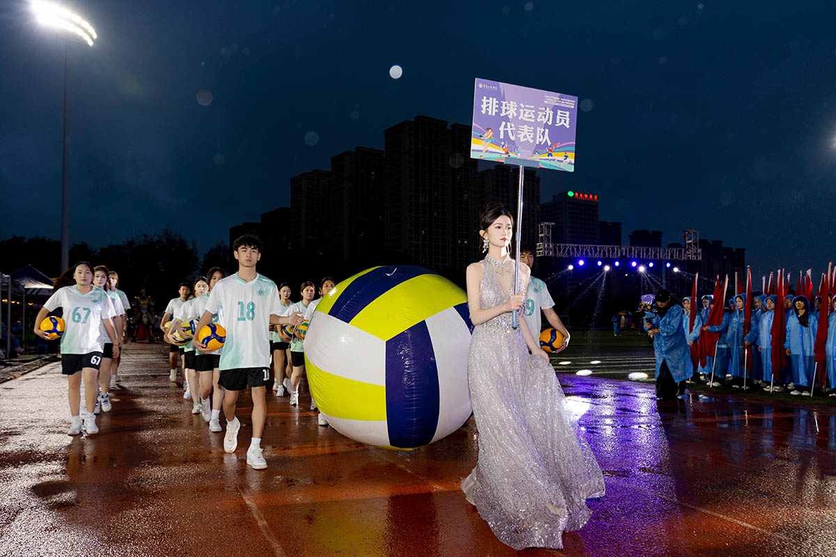 灯光闪耀,欢呼声响。花车缓缓驶入学校,演员舞步翩跹,如诗如画;八支球类方队,昂首阔步,似雄鹰展翅。乒乓球拍舞动白光,羽毛球如流星划过,网球轻跃灵动,排球力拔山河,足球逐风奔跑,篮球掌控节奏……同学们矫健的步伐在运动场上勾勒青春轨迹,以昂扬的姿态书写热血序章!