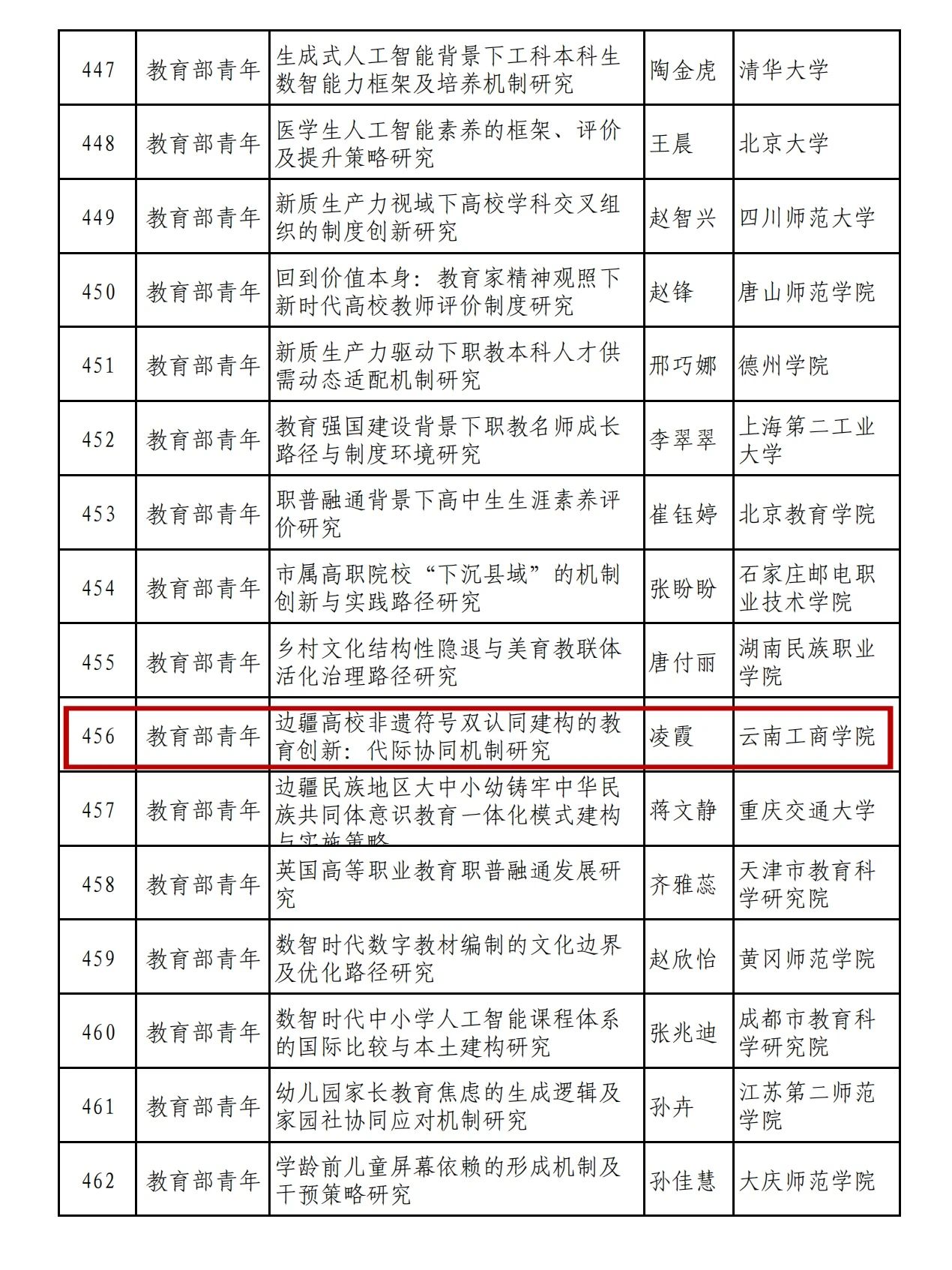 近日,全国教育科学规划领导小组办公室发布《2025年度全国教育科学规划拟立项名单公示》,学校文法学院教师凌霞主持申报的《边疆高校非遗符号双认同建构的教育创新:代际协同机制研究》成功入选全国教育科学规划教育部青年课题,beat365官方网站也成为此次省内唯一入选的高校。