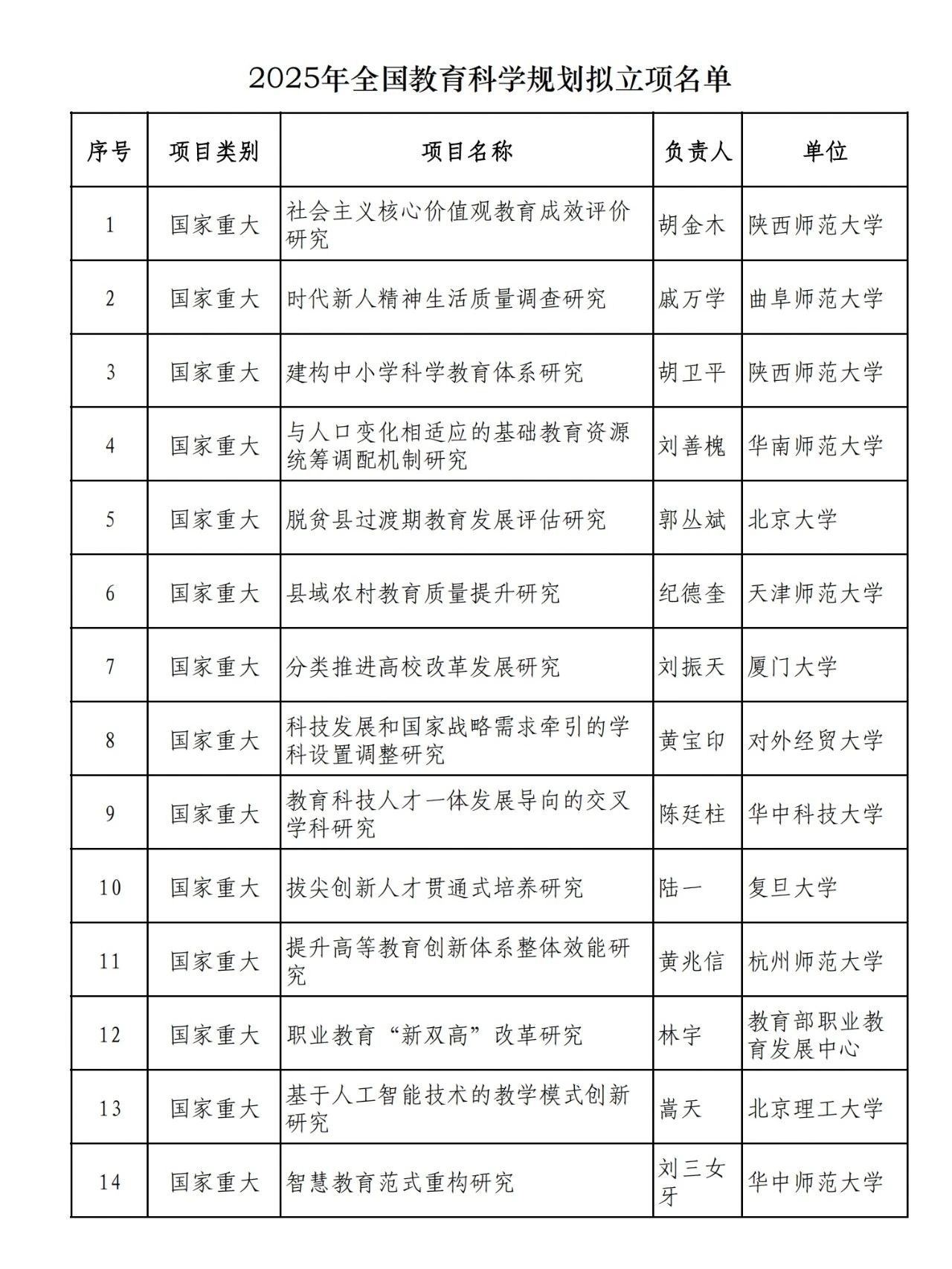 全国教育科学规划办(全国教育科学规划领导小组办公室,简称规划办)正式成立于1983年,是教育部全国教育科学规划领导小组的常设办事机构。全国教育科学规划课题是我国教育科学研究领域层次最高、竞争最为激烈的学术研究项目,2025年度共拟立项540项,其中包括189所高校。