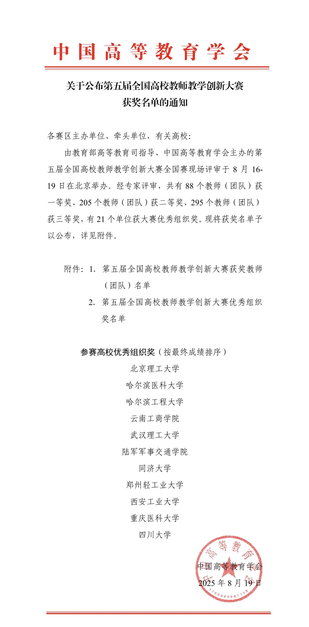 全国高校教师教学创新大赛是经教育部高等教育司指导、中国高等教育学会主办的全国性教学赛事,是引领高等教育高质量发展的国家级最具权威的教学竞赛。该赛事历经校赛、省赛、国赛三级严格选拔,仅不足1%的参赛教师(团队)能从超10万名选手中脱颖而出进入全国总决赛,被誉为高校教师教学领域的“奥林匹克”。