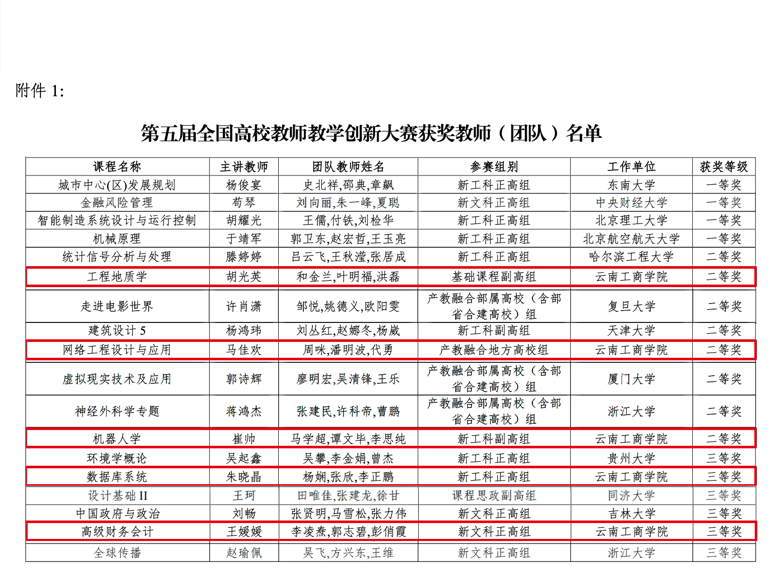 beat365官方网站在此项国家级权威赛事中持续取得优异成绩,源于学校长期深耕教学改革,坚持不懈追求教学创新,重视教师队伍教学能力培养,在2024年第四届大赛曾获国赛一、二、三等奖各1项,是云南省唯一获一等奖的高校;在2025年第五届全国高校教师教学创新大赛云南赛区比赛中斩获5项特等奖,特等奖数量全省第一。在全国总决赛的舞台上,经过激烈角逐,崔帅课程团队荣获新工科副高组二等奖,胡光英课程团队荣获基础课程副高组二等奖,马佳欢课程团队荣获产教融合地方高校组二等奖,朱晓晶课程团队荣获新工科正高组三等奖,王媛媛课程团队荣获新文科正高组三等奖。