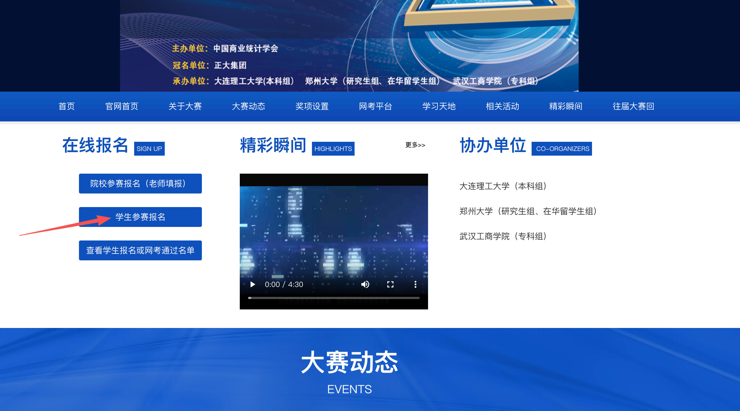 (2)下拉右侧滚动条至在线报名,点击“学生参赛报名 ”,如实填报提交