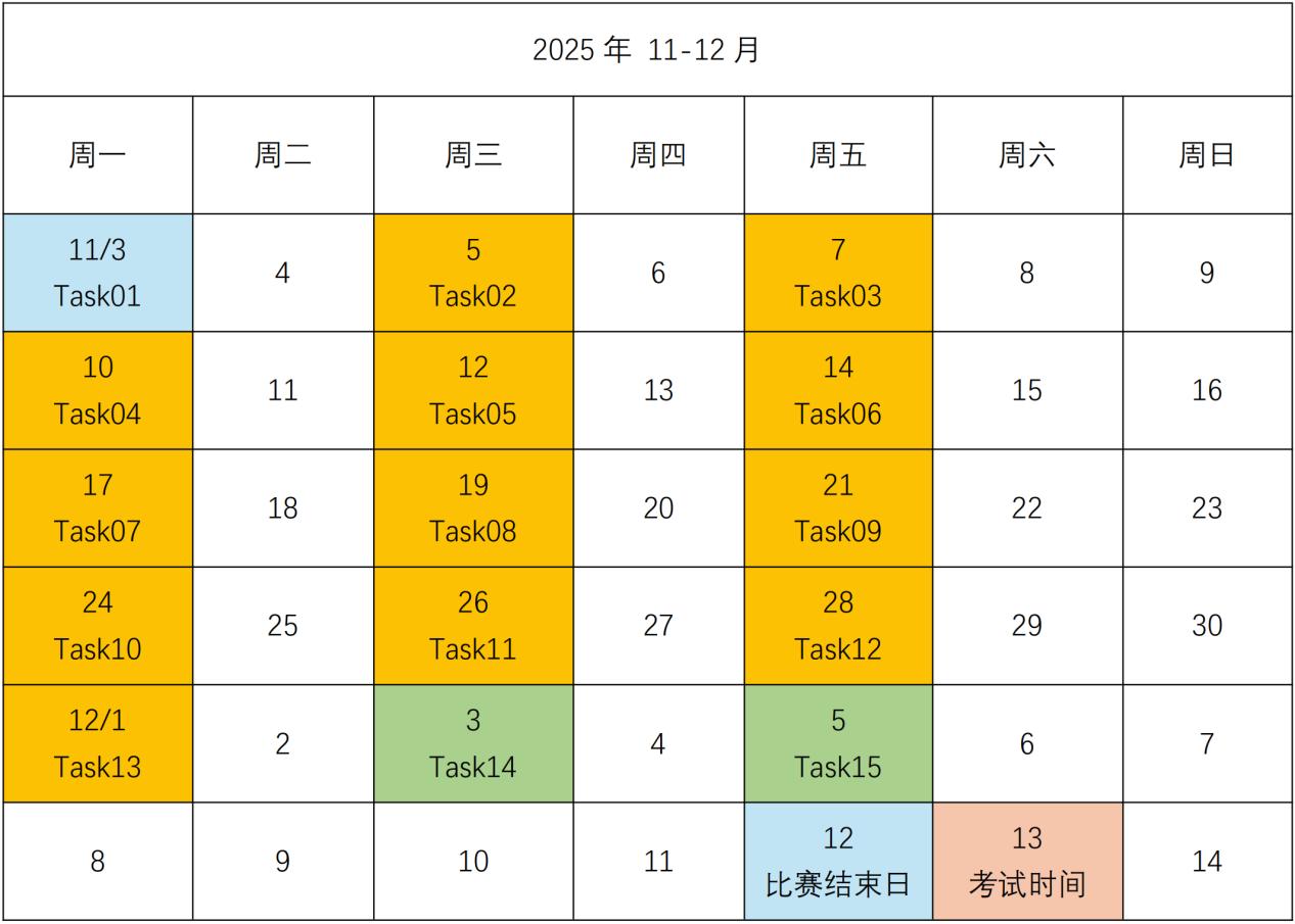 大赛周期为11月3日-12月12日,学生加入班级,在指定时间内完成比赛任务。11月3日起每周一、三、五07:00自动发布1个比赛任务,共15个任务(若比赛中途加入,系统也会补发之前错过的任务)。所有任务的截止时间均为12月13日0点。