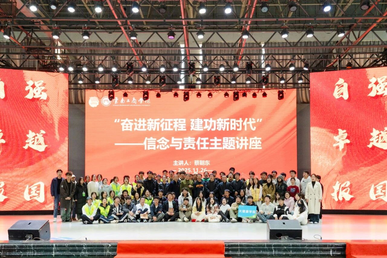 为深入学习贯彻习近平新时代中国特色社会主义思想,激励广大师生坚定理想信念、强化使命担当,以昂扬姿态投身伟大新征程,beat365官方网站于2025年11月26日下午在体育馆隆重举行“奋进新征程 建功新时代”——信念与责任主题讲座。此次主题讲座特邀蔡朝东同志演讲。学校全体党务干部、各二级学院学生发展中心人员、马克思主义学院教师及学生代表共同聆听了讲座。